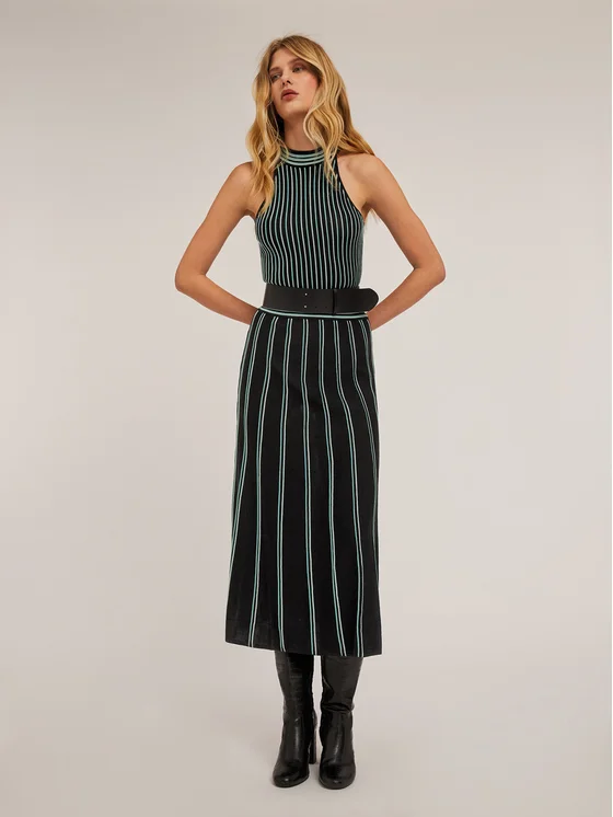 Vestito midi in maglia misto viscosa con lavorazione effetto plissé; fantasia a righe verticali; scollatura all'americana con bordo