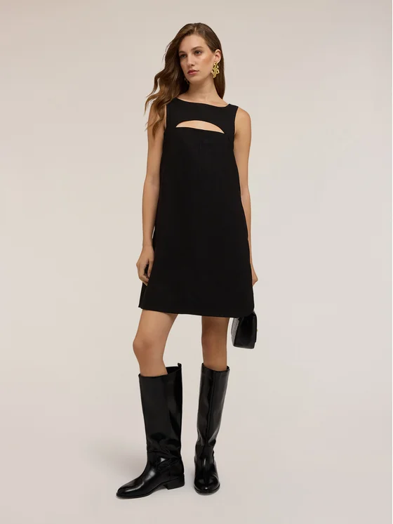Vestito regular in crepe; lunghezza midi, chiusura con zip nel centro dietro; scollatura quadrata, modello senza maniche con dettaglio cut-out sul petto, tasche laterali.