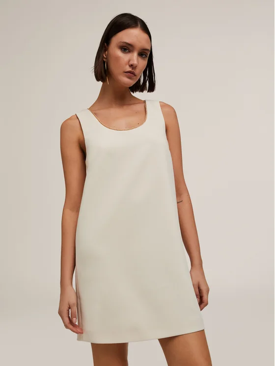 Vestito smanicato a tubino dalla linea ad A in doppio tessuto crêpe con fodera interna; scollatura tonda con dettaglio metal chain color oro; chiusura sul fianco con zip invisibile; Parte di questo prodotto è realizzato con materiale riciclato, minimo il 20%.