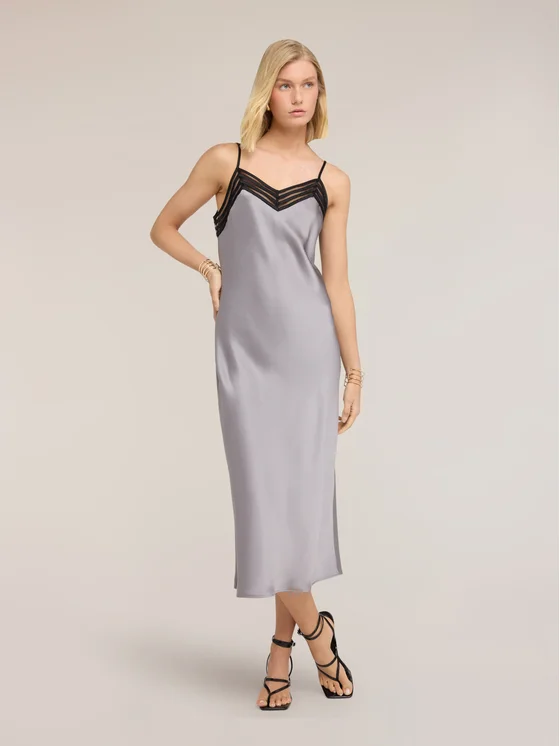 Vestito lungo in raso; spalline sottili regolabili; scollatura a V con inserto in tulle.