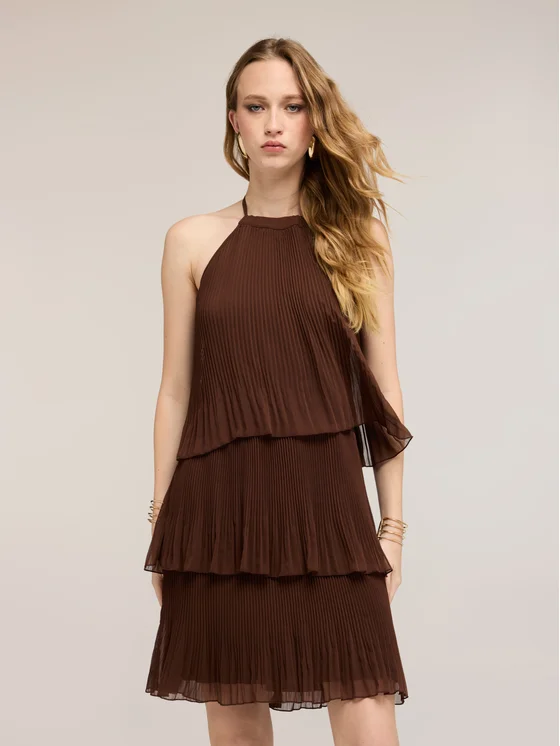 Vestito corto in georgette con lavorazione plissé; scollatura all'americana con chiusura a lacci; modello senza maniche con dettaglio a balze; MADE IN ITALY.