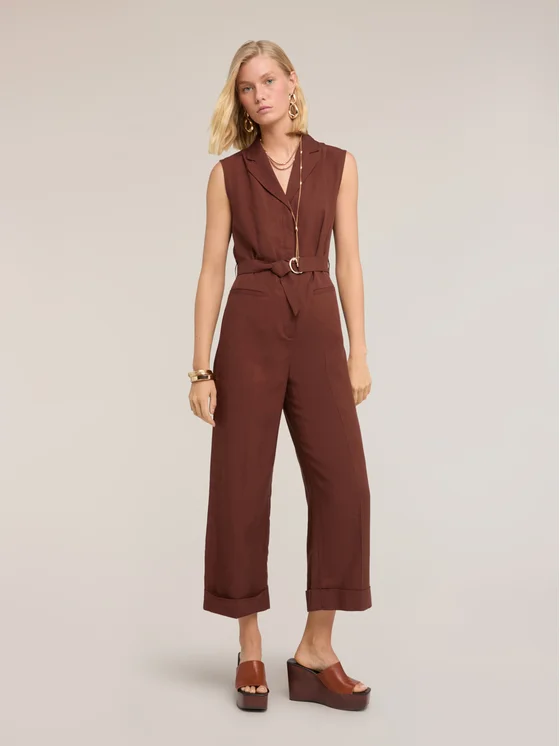 Tuta lunga in tessuto misto lino lyocell; apertura frontale con colletto e abbottonatura all'inglese; modello senza maniche, chiusura con cintura in vita.