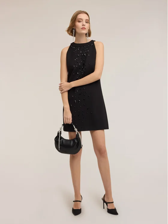 Tubino in tessuto punto milano in filato misto viscosa; scollatura all'americana con chiusura a zip nel centro dietro; applicazione frontale di pietre tono su tono.