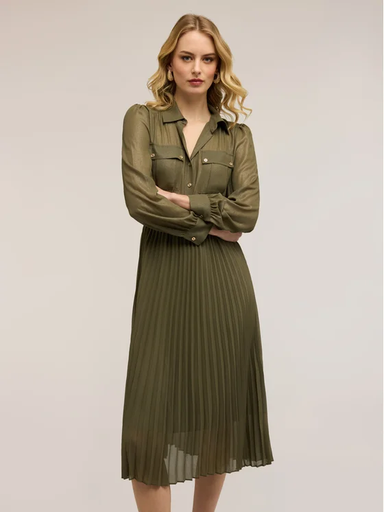 Vestito chemisier in georgette laminata; lunghezza midi, chiusura frontale con colletto classico e bottoni; tasche applicate sul petto con pattina, maniche lunghe a palloncino con polsino, gonna con lavorazione plissé.