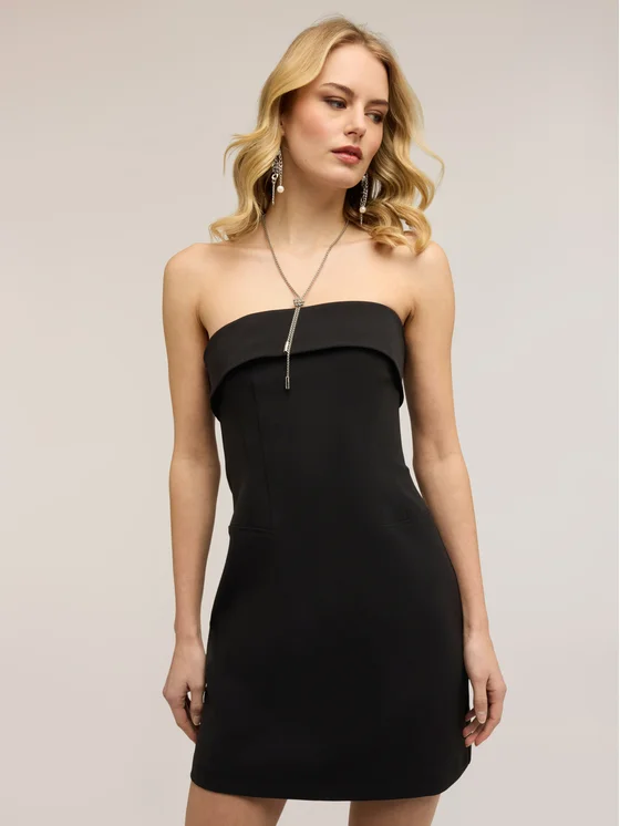 Vestito mini a bustier in tessuto crêpe; chiusura con zip invisibile nel centro dietro; scollatura a barchetta con risvolto.