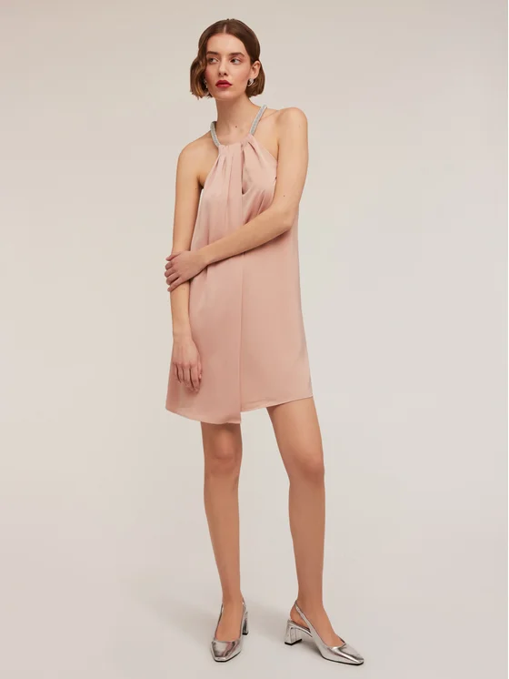 Mini dress elegante in raso; scollatura all'americana con dettaglio collana; linea svasata con motivo a portafoglio