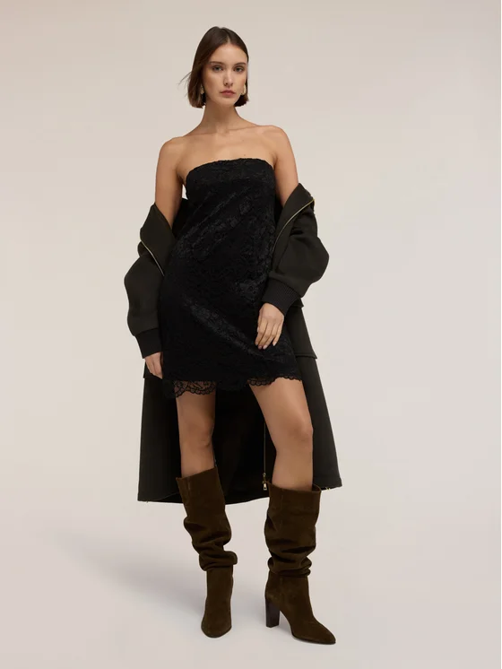 Minidress in pizzo con fodera interna; chiusura zip; scollatura quadrata con spalline sottili; MADE IN ITALY.
