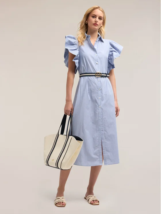 Vestito chemisier in cotone a righe; colletto a vela e bottoni a vista; maniche corte a maxi volant, lunghezza midi