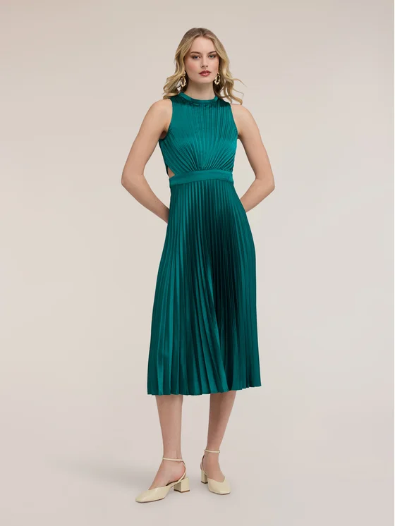 Vestito in raso con lavorazione plissé; modello senza maniche con cut-out laterali in vita, fascia in vita tono su tono, chiusura con zip nel centro dietro; scollatura girocollo, gonna midi svasata.
