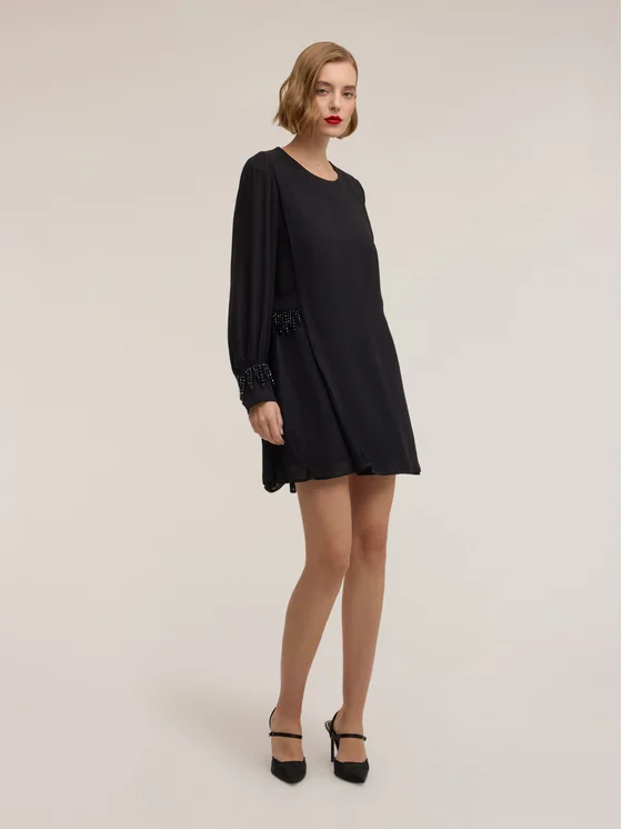 Vestito mini in chiffon in viscosa; scollatura tonda con apertura a goccia posteriore; maniche lunghe con applicazioni a frange gioiello.
