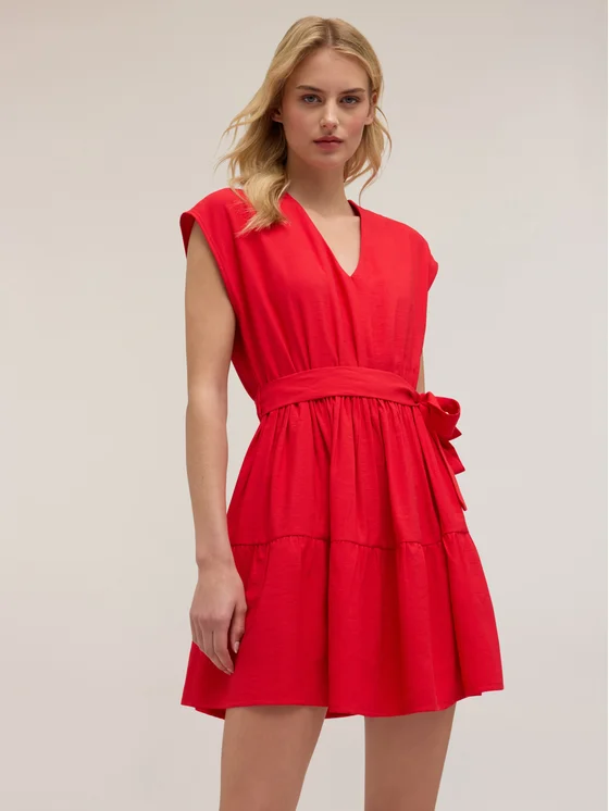 Vestito in jersey misto viscosa; corpino con scollatura a v e maniche corte taglio a kimono; elastico interno in vita e fusciacca tono su tono, gonna corta con balza al fondo