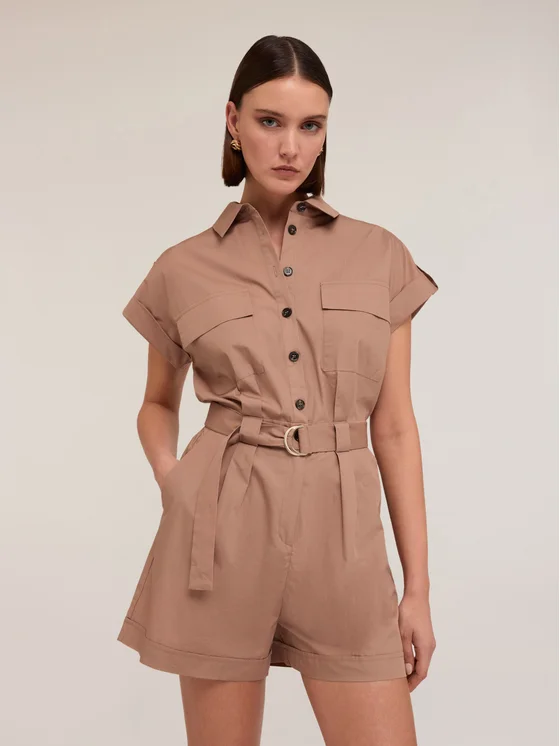 Tuta corta in popeline di cotone; apertura frontale con colletto a vela e bottoni a vista, tasche anteriori alla sahariana applicate; maniche corte taglio a kimono con mostrine, shorts con risvolto impunturato sul fondo