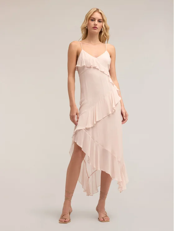 Vestito con balze a rouches in georgette; scollatura a cuore con spalline fini; chiusura con zip laterale, lunghezza midi