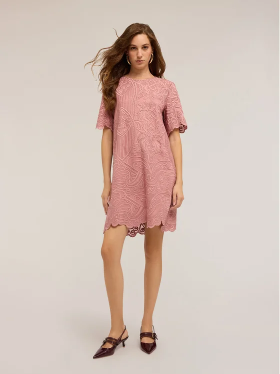 Vestito in organza ricamata, con smerlo al fondo; scollo tondo e chiusura dietro con bottone; maniche al gomito