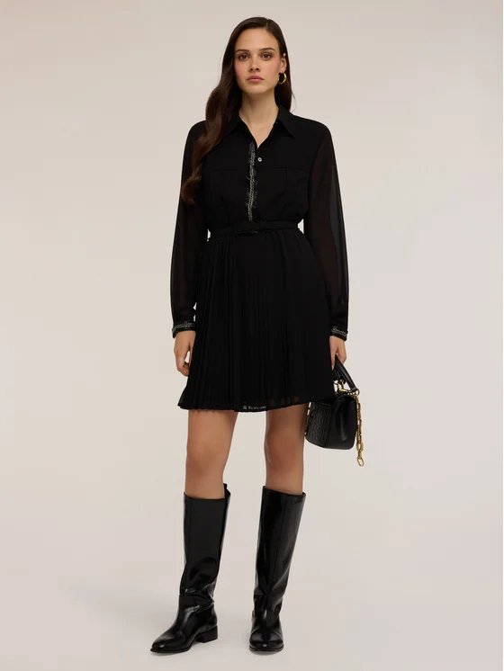 Vestito ricamato con canottiglie in tessuto crêpe; apertura frontale con colletto a vela e abbottonatura all'inglese, vita elasticizzata con cinturino; maniche lunghe con polsino sul fondo, gonna corta a pieghe