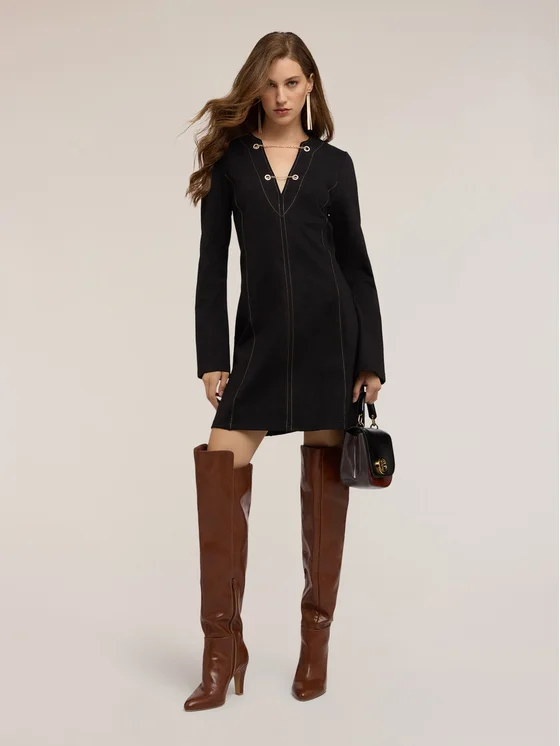 Vestito tubino in punto milano misto cotone; lunghezza media, scollatura a "V" con applicazioni di catene decorative; maniche lunghe, cuciture a contrasto che delineano la silhouette.