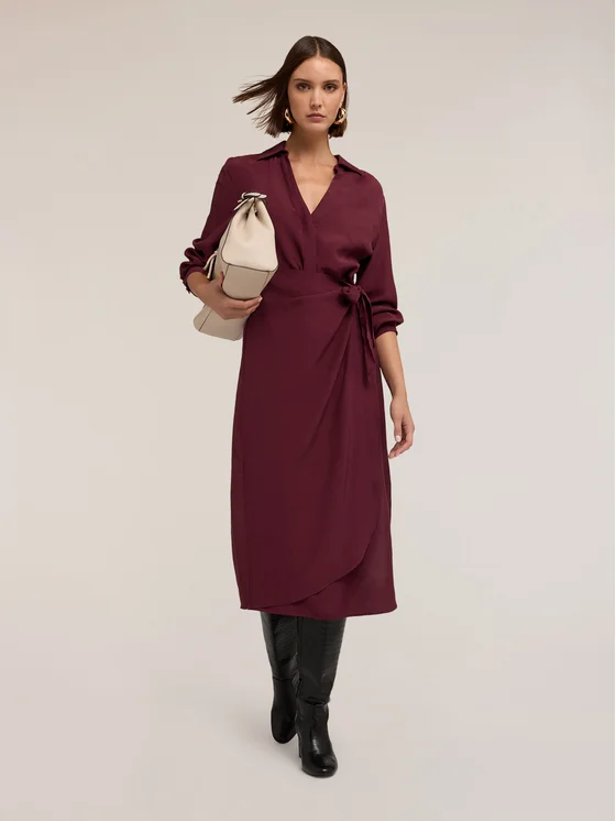 Vestito midi in viscosa; scollatura frontale a v con colletto a vela; gonna a portafoglio con spacco laterale, maniche lunghe