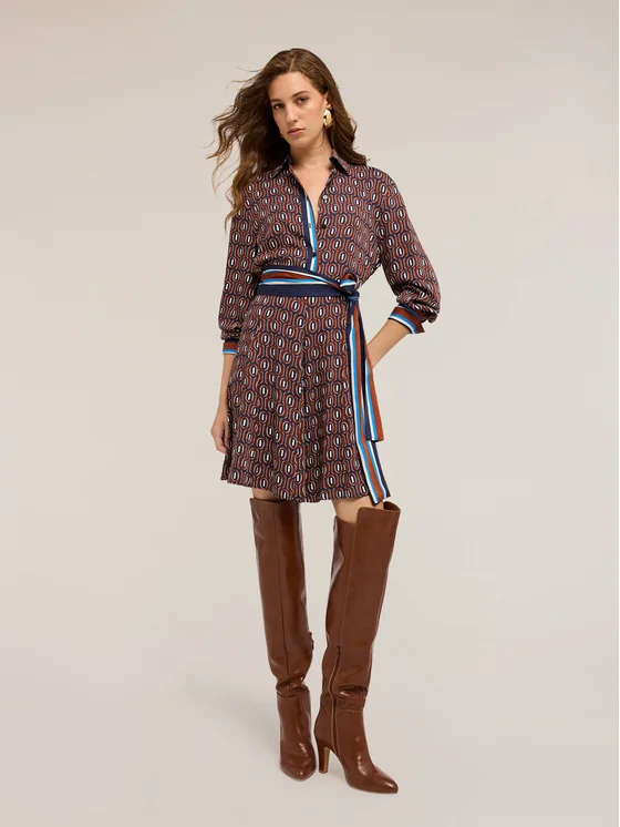 Vestito chemisier in raso fantasia geometrica; colletto a vela e apertura frontale con bottoni a vista; maniche lunghe con polsino sul fondo, gonna corta svasata