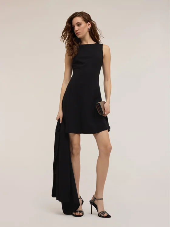 Mini dress in punto milano; modello senza maniche a spalla larga con scollatura a barca; gonna corta svasata sul fondo, chiusura con zip nel centro dietro