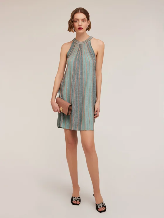 Mini dress in maglia misto viscosa lurex con lavorazione plissé; scollatura halter neck; linea svasata ad a