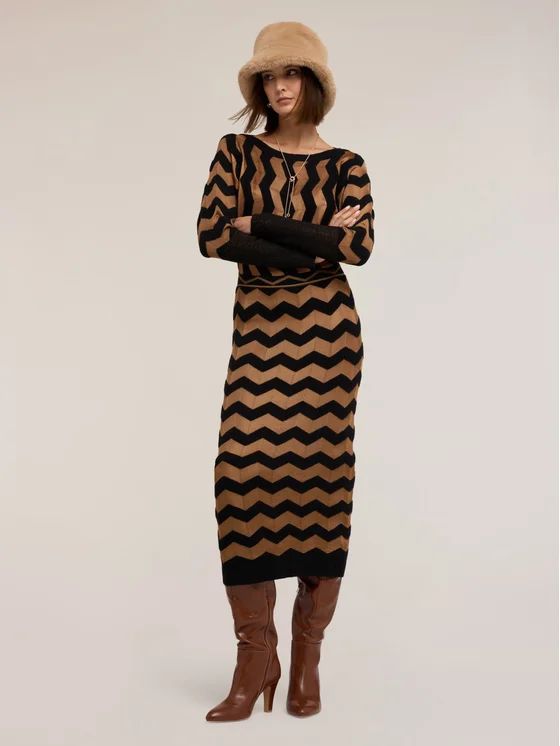 Vestito lungo in tessuto jacquard misto lana fantasia chevron; scollatura tonda; maniche lunghe con polsino sul fondo.