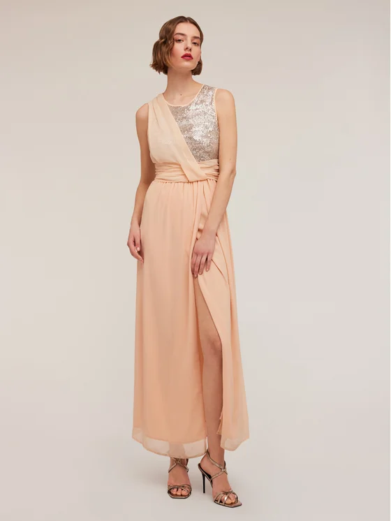 Vestito a peplo in georgette; corpino full paillettes con scollatura tonda e chiusura con zip nel centro dietro; gonna lunga fluida con maxi spacco
