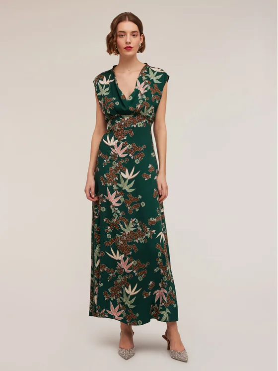 Vestito lungo fantasia decò in tessuto fluido; corpino con scollatura a v e leggero drappeggio; maniche ad aletta, chiusura con zip nel centro dietro