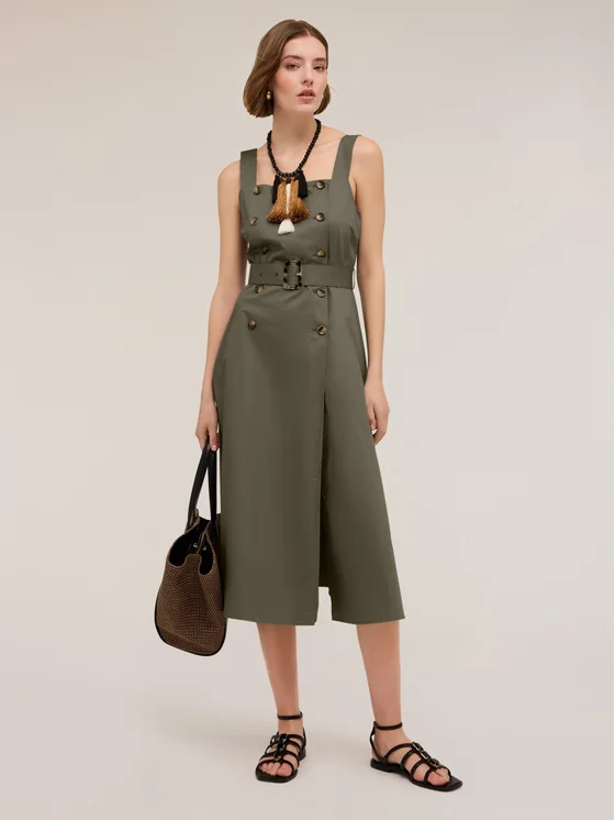 Vestito in popeline di cotone tinta unita; scollatura quadrata frontale e spalle larghe, motivo con abbottonatura a doppiopetto e bottoni a vista; cintura in vita tono su tono, chiusura con zip laterale, gonna lunghezza midi con alto spacco e tasche verticali