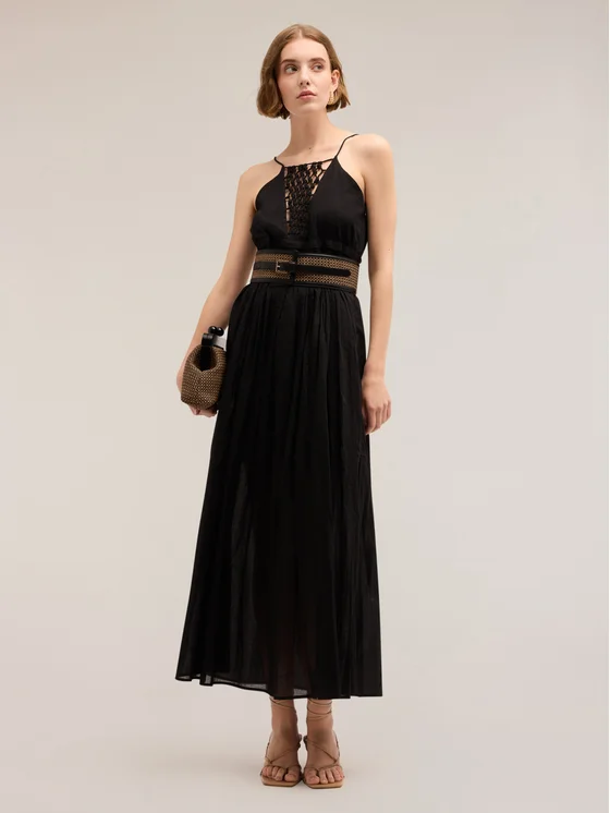 Vestito in mussola di cotone con fodera interna; corpino con scollatura all'americana ed inserto ricamato effetto crochet; apertura laterale con zip, gonna lunga svasata
