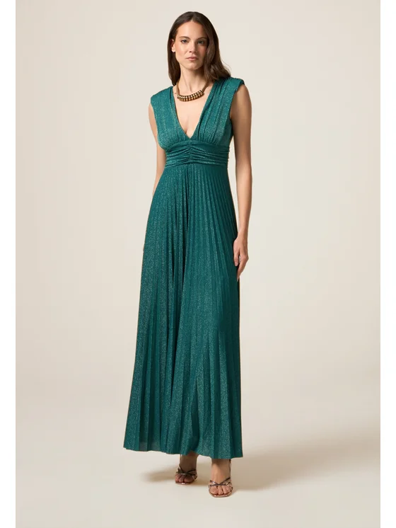 Vestito lungo realizzato in jersey lurex a lavorazione plissé; dettaglio drappeggiato in vita; profonda scollatura a V sul davanti e sulla schiena; MADE IN ITALY.