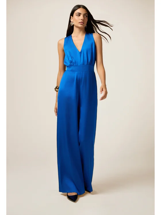 Tuta lunga realizzata in raso di viscosa; senza maniche, scollatura a V davanti e dietro; vita elasticizzata sul retro; MADE IN ITALY.