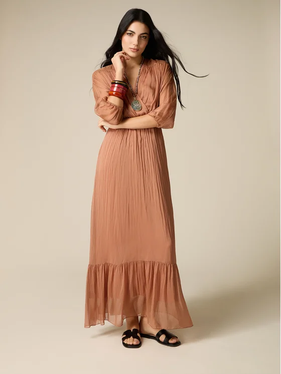 Vestito lungo realizzato in voile misto seta; lavorazione stropicciata; scollo a V ad incrocio, maniche a tre quarti con polsino elasticizzato; balza con volant sull'orlo inferiore. MADE IN ITALY.