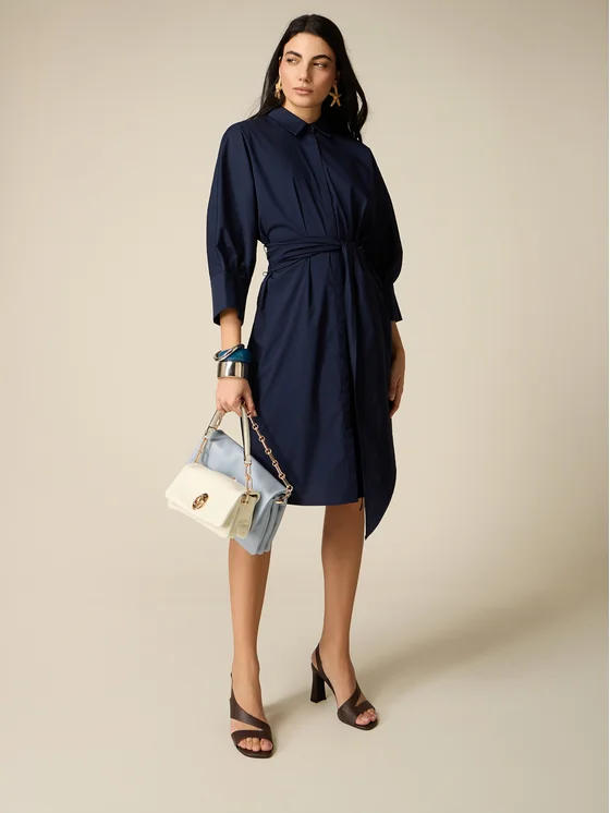 Vestito chemisier realizzato in popeline misto cotone; lunghezza media, fusciacca da annodare a fiocco in vita; colletto classico, maniche a tre quarti.