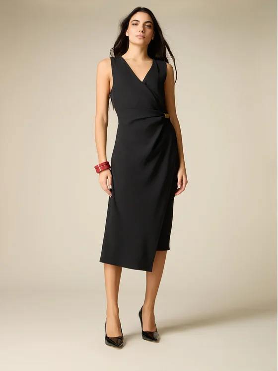 Vestito tubino realizzato in tessuto crêpe tinta unita; lunghezza midi, lavorazione drappeggiata sul fianco cornata da dettaglio metallico decorativo; senza maniche, scollatura ad incrocio; MADE IN ITALY.