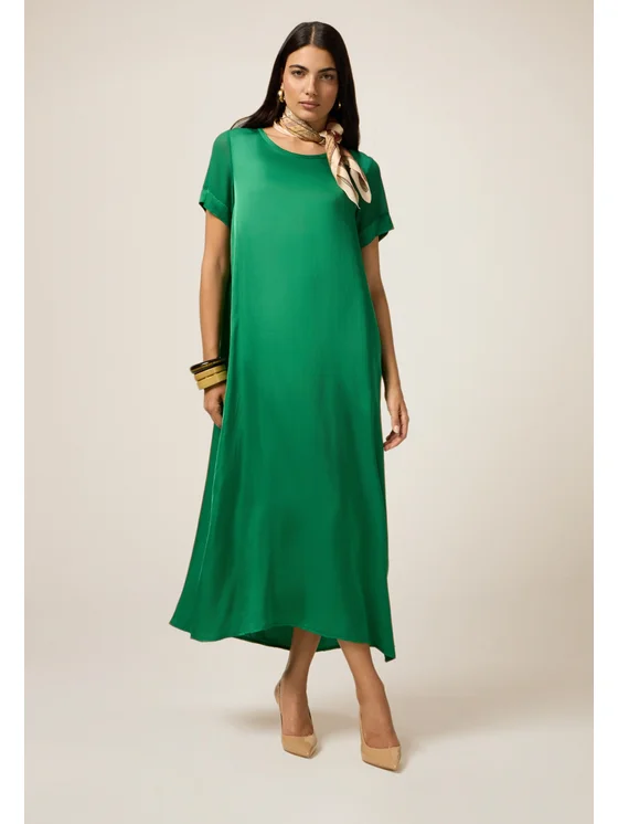 Vestito realizzato in fluido raso di viscosa; linea dritta; maniche corte, scollatura tonda, tasche laterali nascoste; MADE IN ITALY.