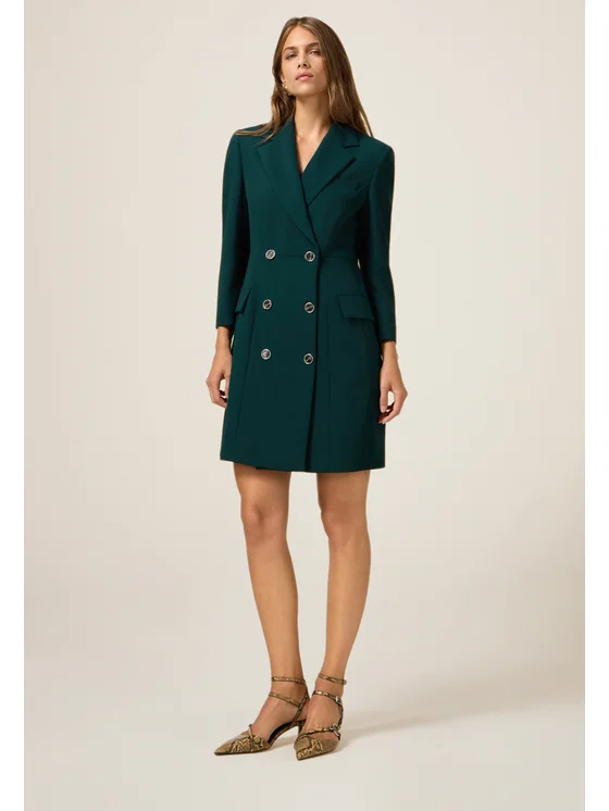 Vestito realizzato in tessuto crêpe tinta unita; chiusura doppiopetto, maniche a tre quarti, colletto a revers, tasche applicate; MADE IN ITALY.