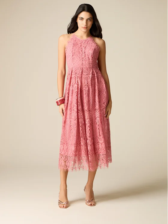 Vestito realizzato in pizzo misto cotone; scollatura tonda, schiena see-through, chiusura a zip posteriore; gonna svasata con fodera interna, fondo smerlato.