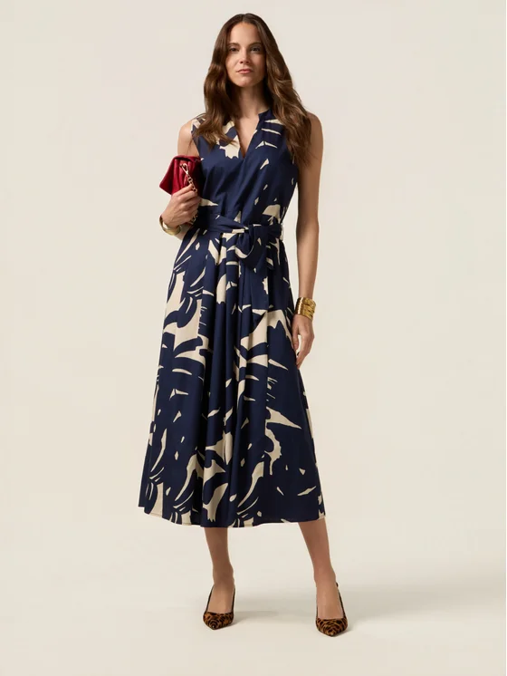Vestito senza maniche realizzato in popeline di cotone a fantasia foliage; lunghezza midi, fusciacca da annodare in vita; scollatura a V.