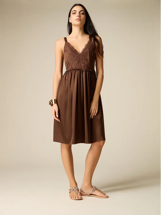 Vestito realizzato in fluido raso tinta unita; senza maniche, vita arricciata con elastico; scollatura a V e parte alta impreziosita da un inserto in pizzo tono su tono.