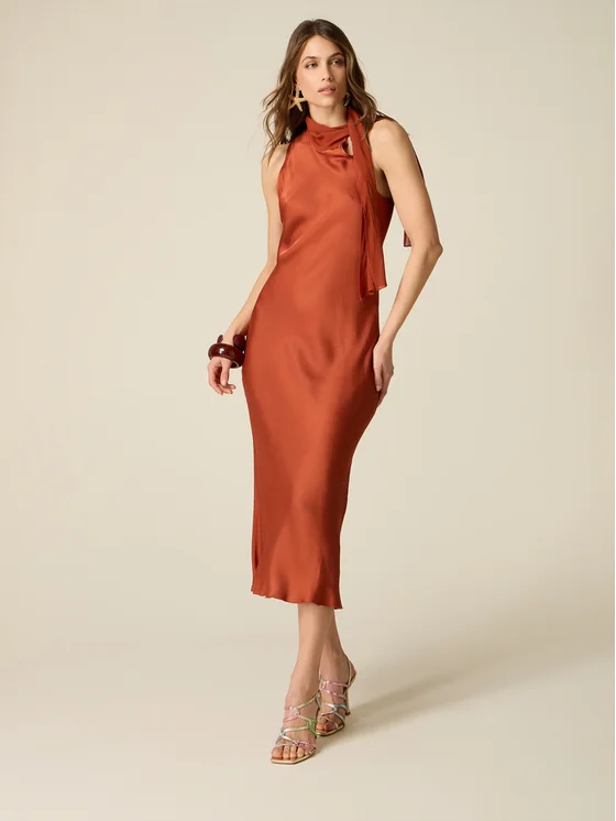 Vestito tubino lungo realizzato in fluido raso di viscosa; modello senza maniche con fiocco da annodare al collo; MADE IN ITALY.