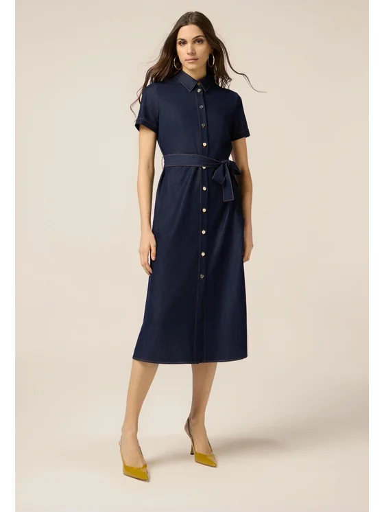 Vestito chemisier lungo realizzato in tessuto effetto denim; maniche corte, dettaglio di bottoni davanti; fusciacca da annodare in vita.