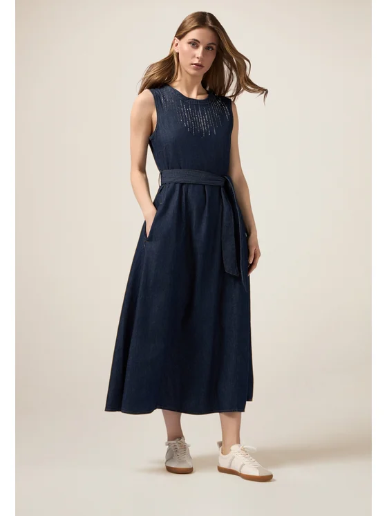 Vestito lungo realizzato in denim a lavaggio blu scuro rinse; senza maniche, con applicazione di micro cristalli davanti; scollatura tonda, chiusura con zip sulla schiena, cintura da annodare in vita.