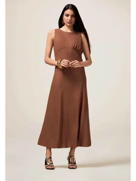 Vestito lungo senza maniche realizzato in tessuto fluido misto viscosa; dettaglio di drappeggio sul busto; scollatura a barchetta davanti e a V sulla schiena.; il capo ha una vestibilità ridotta, si consiglia di acquistare un taglia in più.