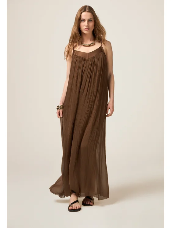 Maxi tuta realizzata in voile misto seta; vestibilità ampia e fluida, tape in raso sulla parte alta; scollatura a V, spalline sottili da annodare a fiocco; MADE IN ITALY.