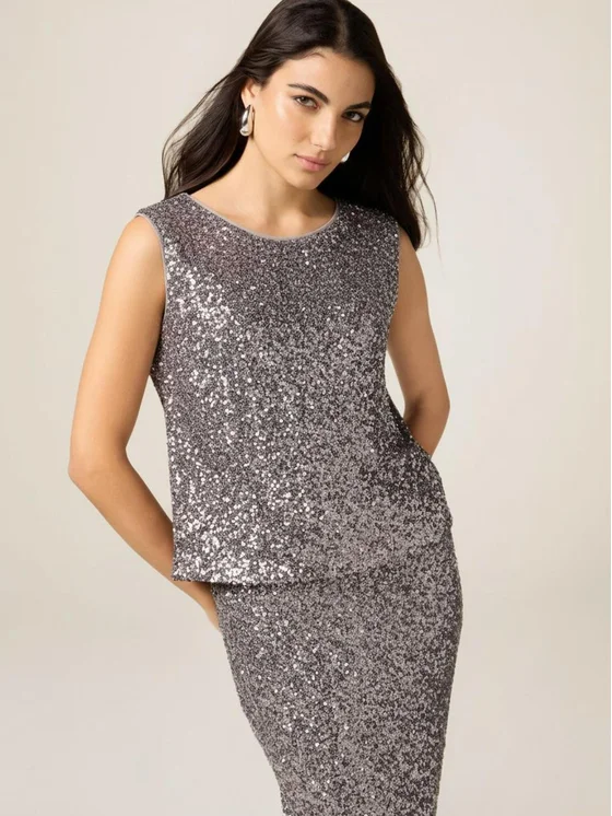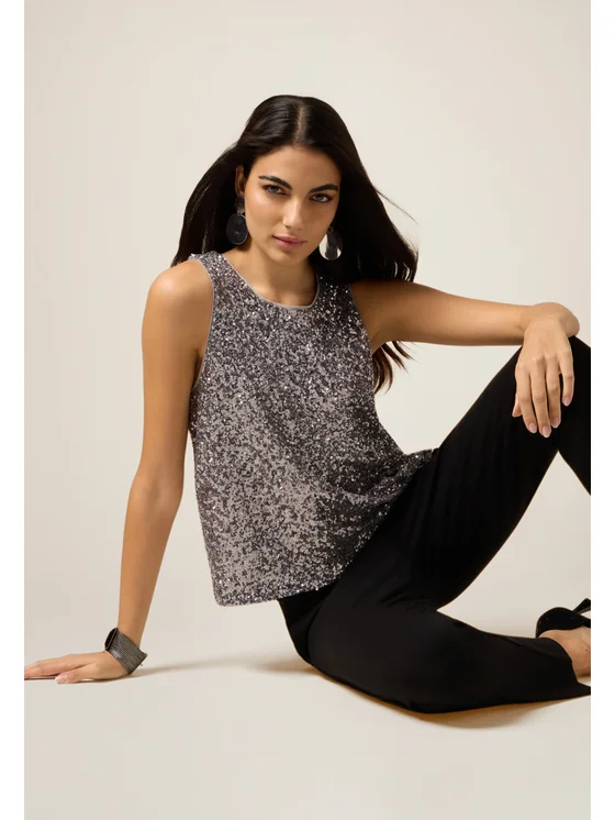 Top realizzato in tulle con lavorazione full paillettes; modello senza maniche con vestibilità regular, scollatura tonda; possibilità di abbinarlo alla gonna coordinata.