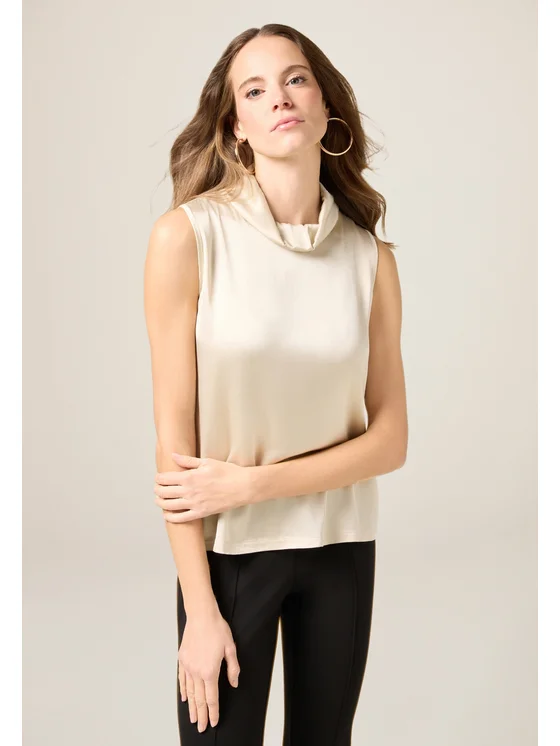 Top realizzato in fluido raso misto viscosa; scollatura a dolcevita e modello senza maniche; MADE IN ITALY.