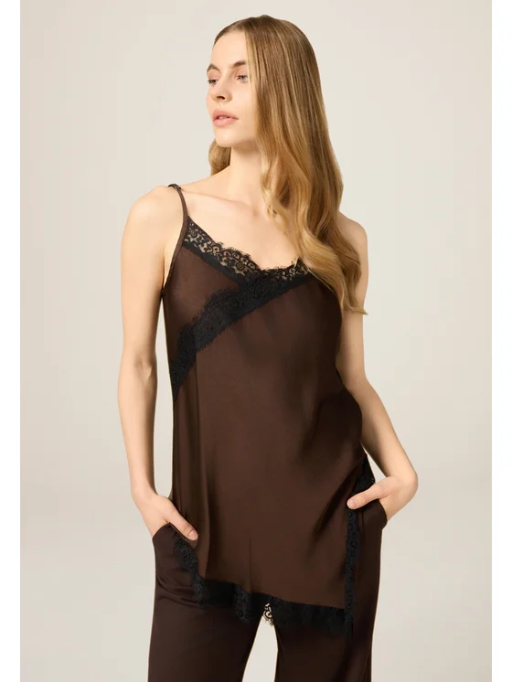 Top realizzato in fluido raso di viscosa; design asimmetrico; scollatura a V con spalline sottili e profili in pizzo a contrasto colore; MADE IN ITALY.