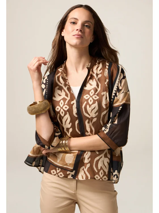 Blusa realizzata in fresca mussola di cotone a fantasia etnica; linea dritta, maniche a tre quarti; Scollatura aperta sul davanti, lavorazione tinto capo.