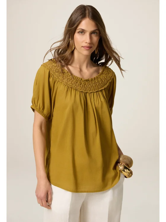 Blusa in mussola misto cotone; linea over, maniche corte; scollatura a barchetta ornata da bordo in pizzo crochet.