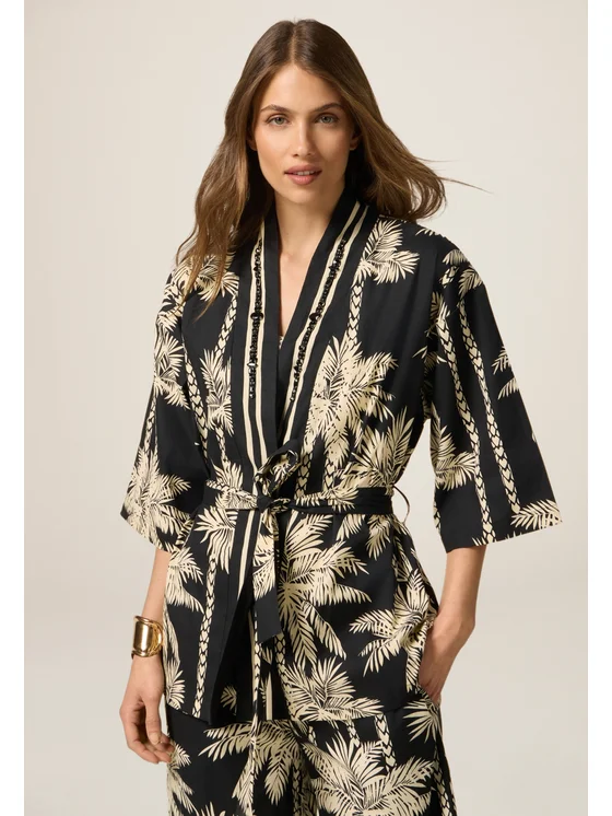 Kimono realizzato in fresco popeline di cotone fantasia; maniche a tre quarti, cintura da annodare in vita e ricamo in castoni sull'apertura davanti; possibilità di abbinarlo ai pantaloni coordinati.